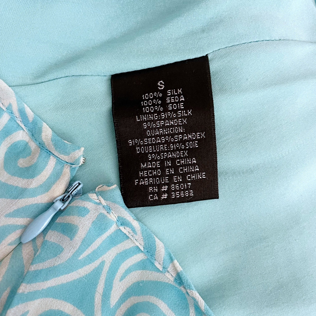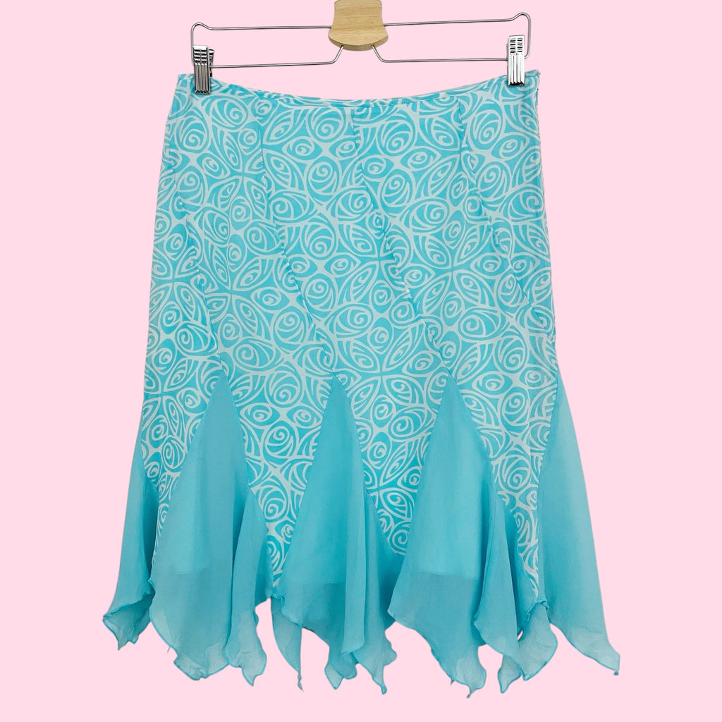 AQUA + WHITE PRINTED SILK MIDI SKIRT (S)