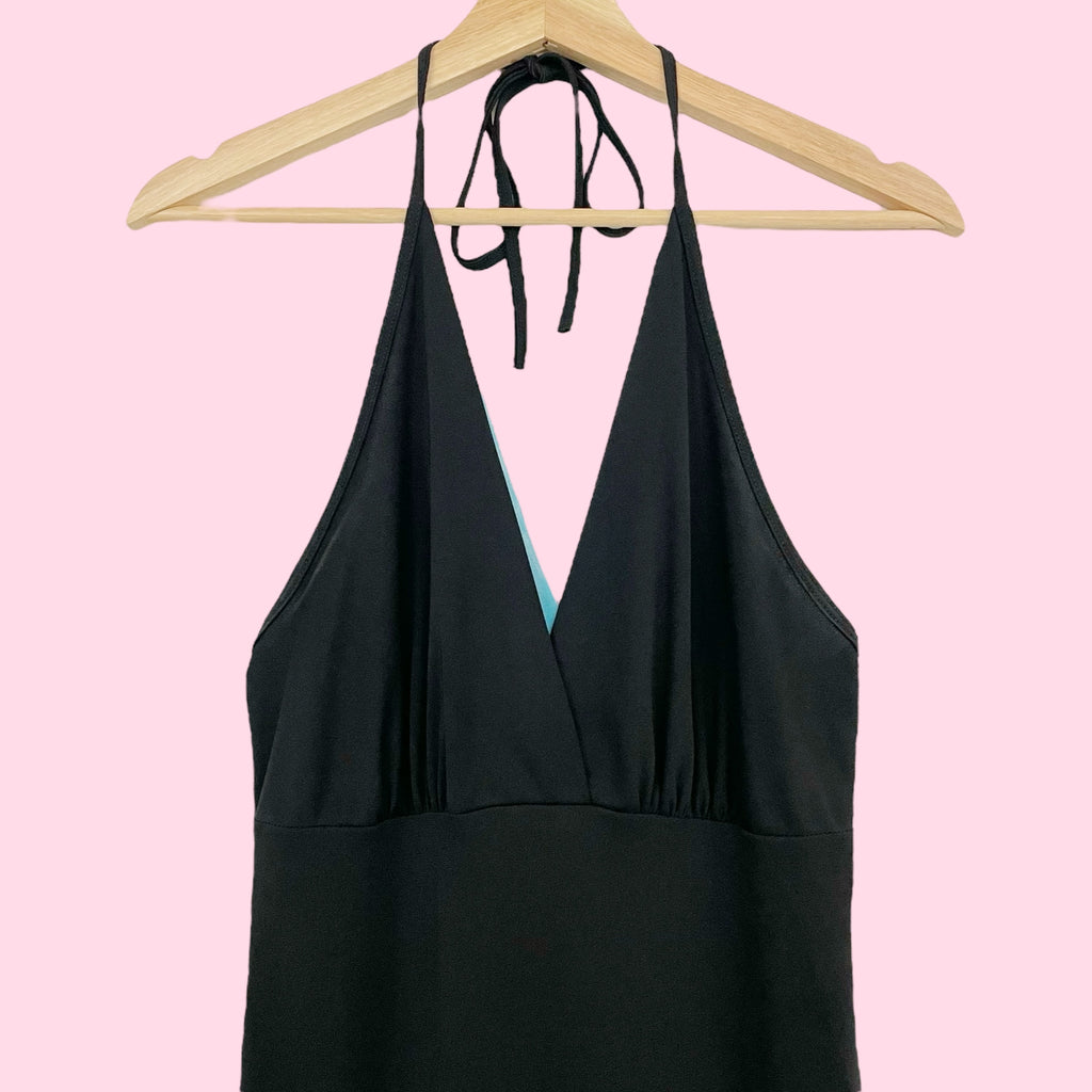 BLACK + AQUA BEADED FLORAL HALTER MIDI DRESS (S)