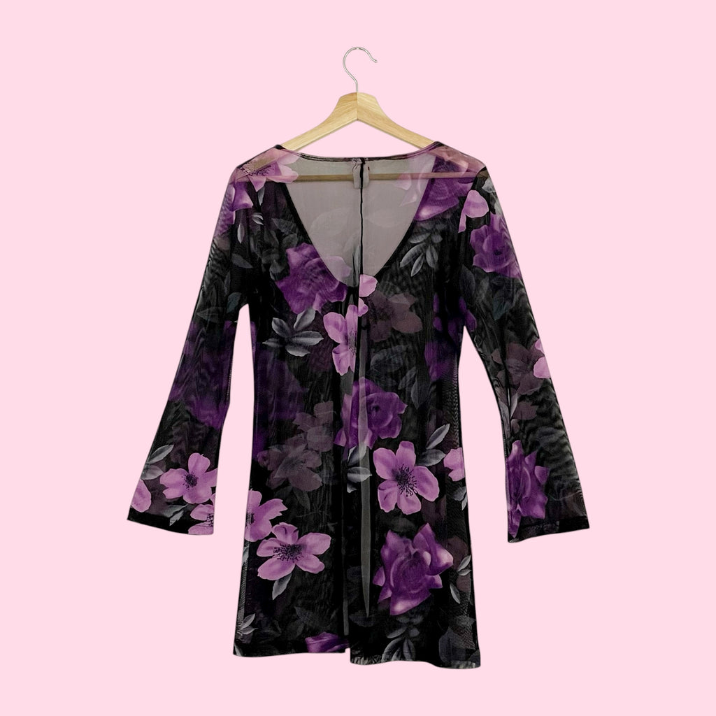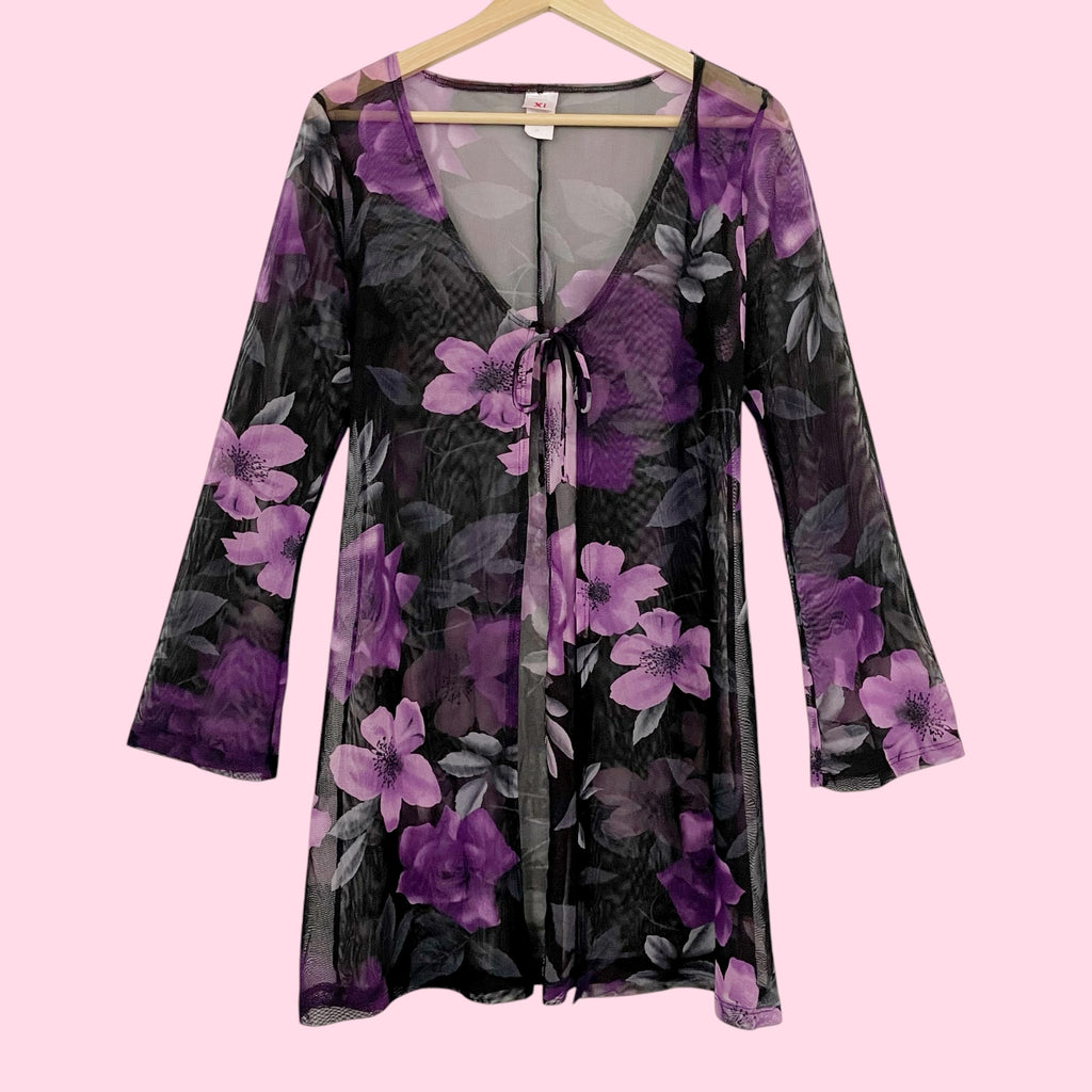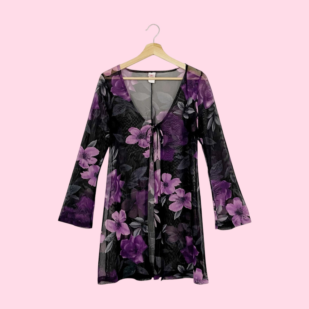 BLACK + PURPLE FLORAL MESH TIE FRONT COVER UP (M)