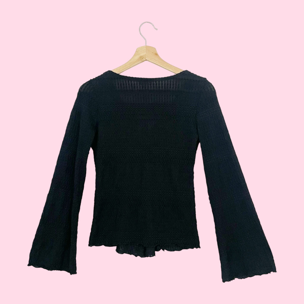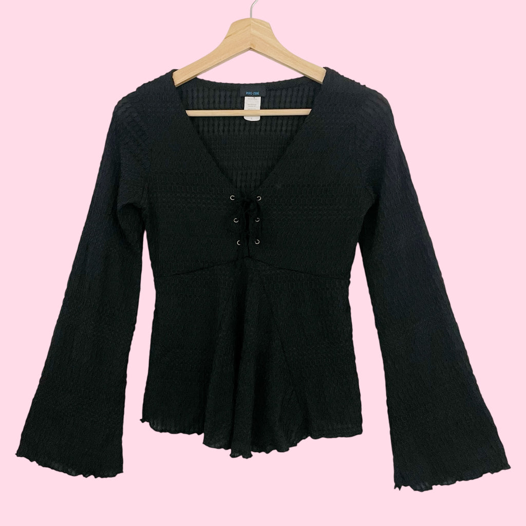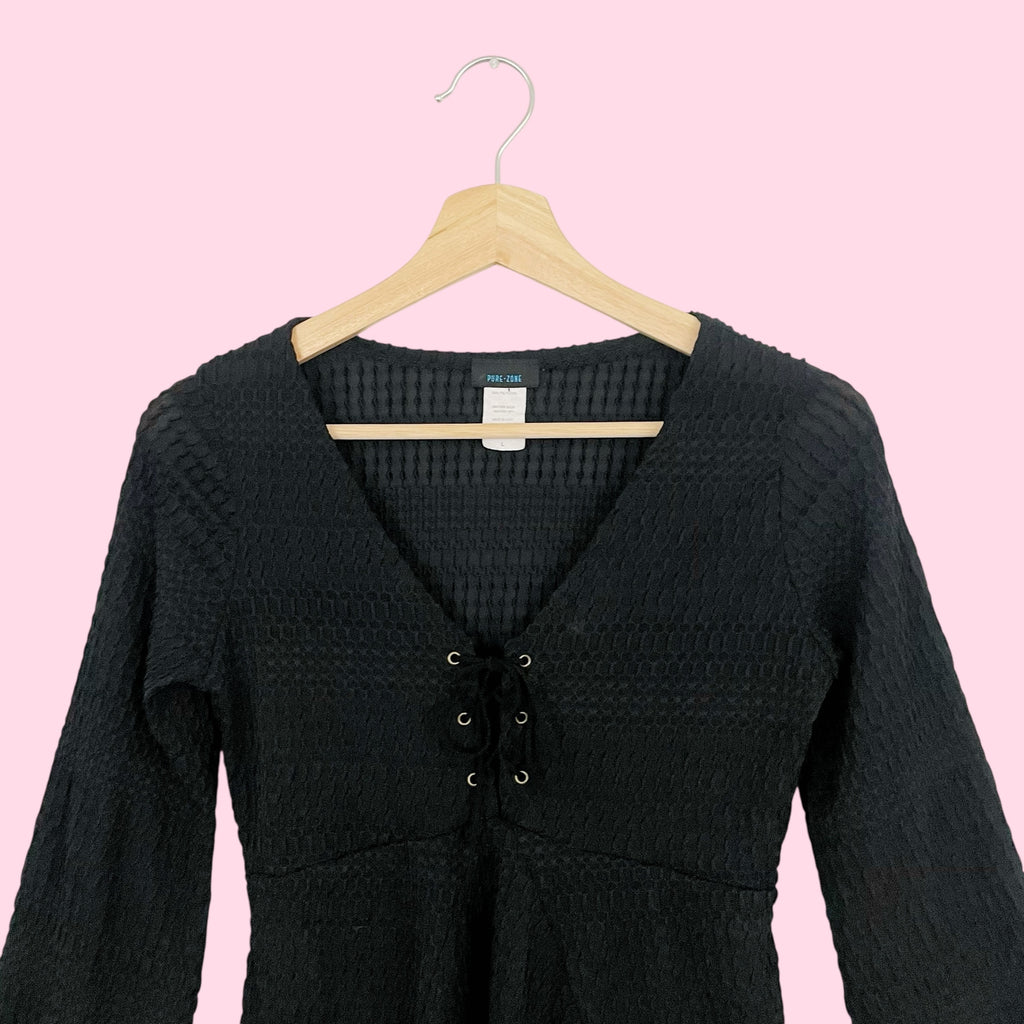 BLACK TEXTURED LACE UP BELL SLEEVE TOP (M)