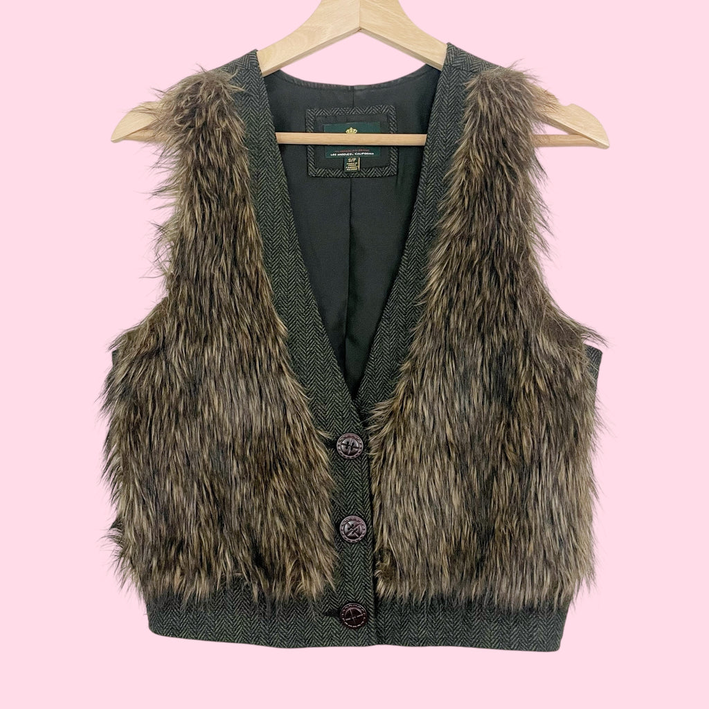 BROWN FAUX FUR PANEL TWEED VEST (S)