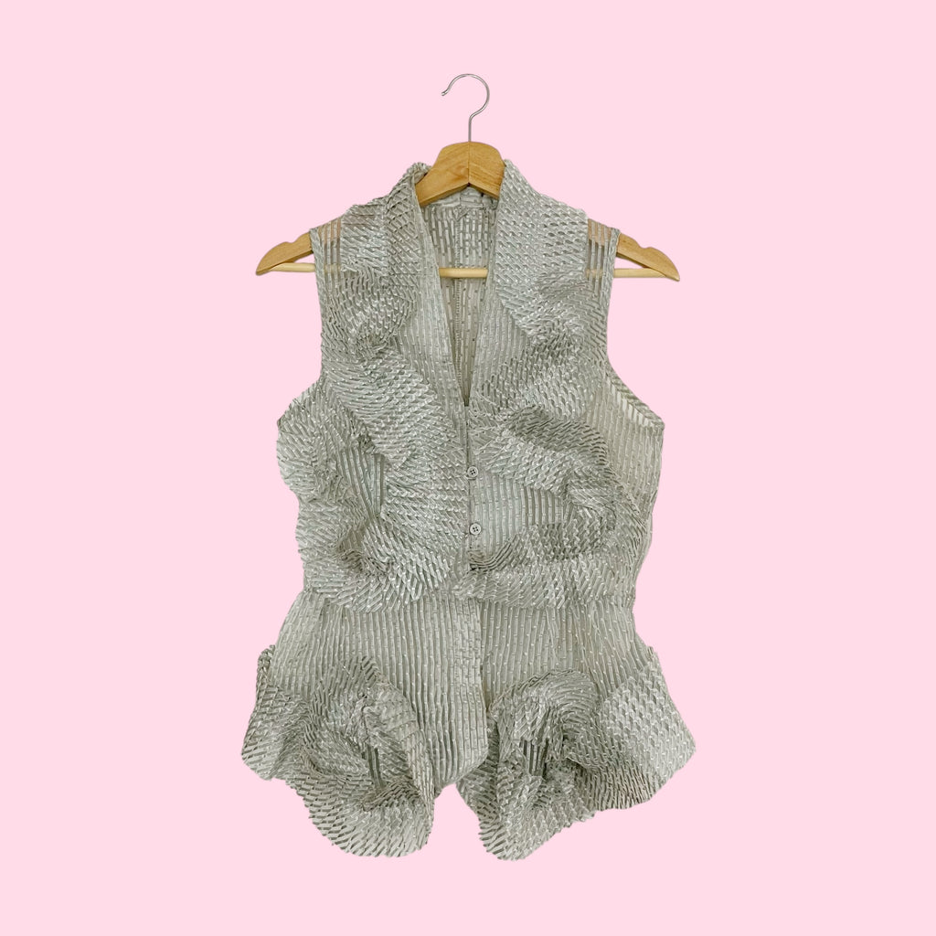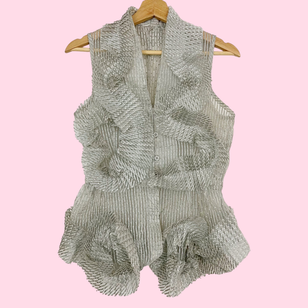 Gray Striped Sheer Pleated Ruffle Blouse (S)
