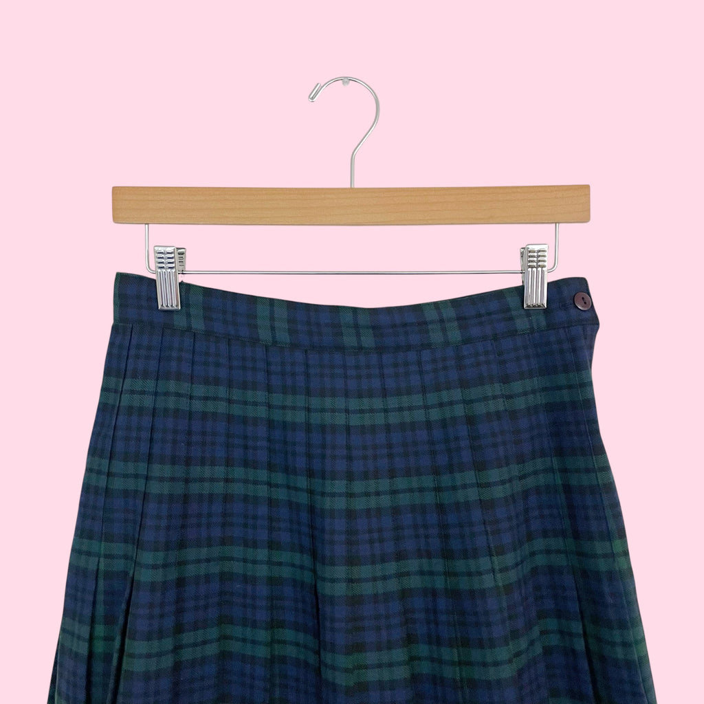 Green + Navy Plaid Pleated Knee Length Skirt (S)