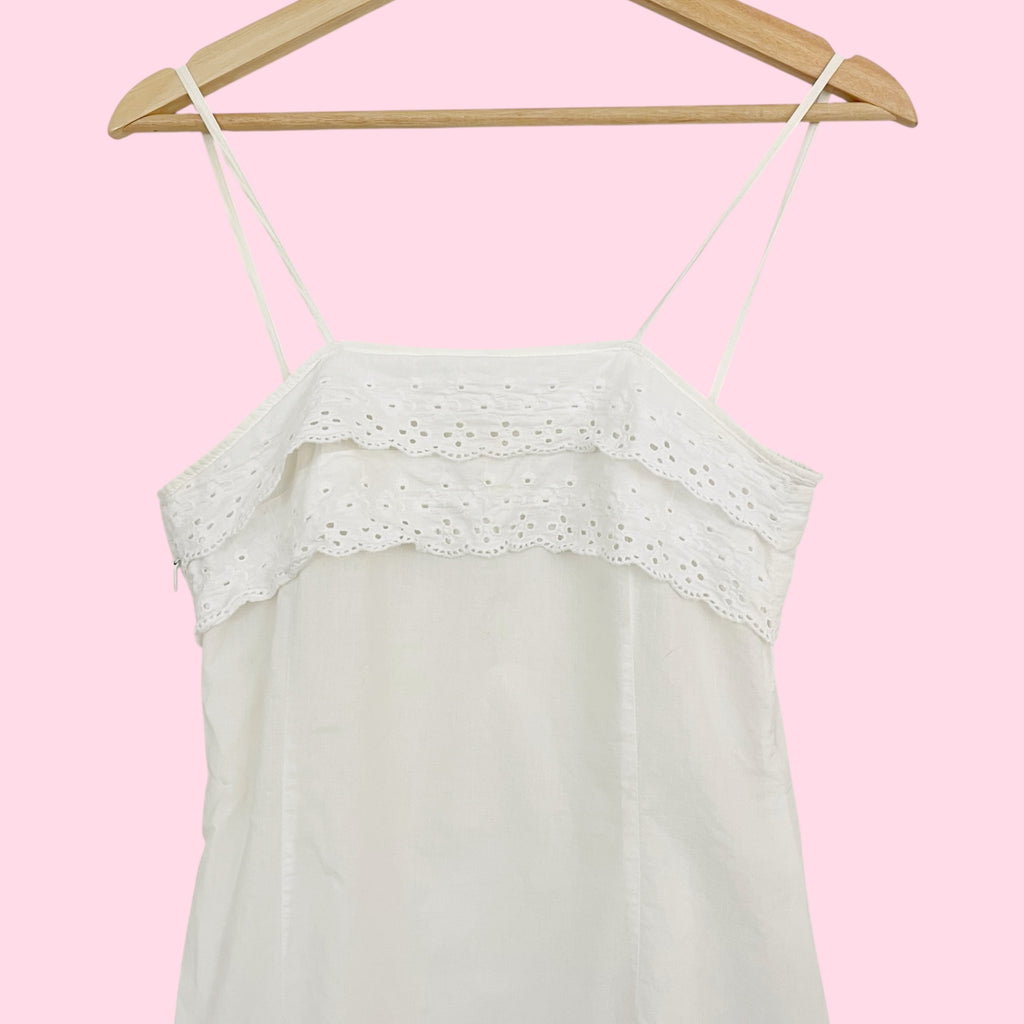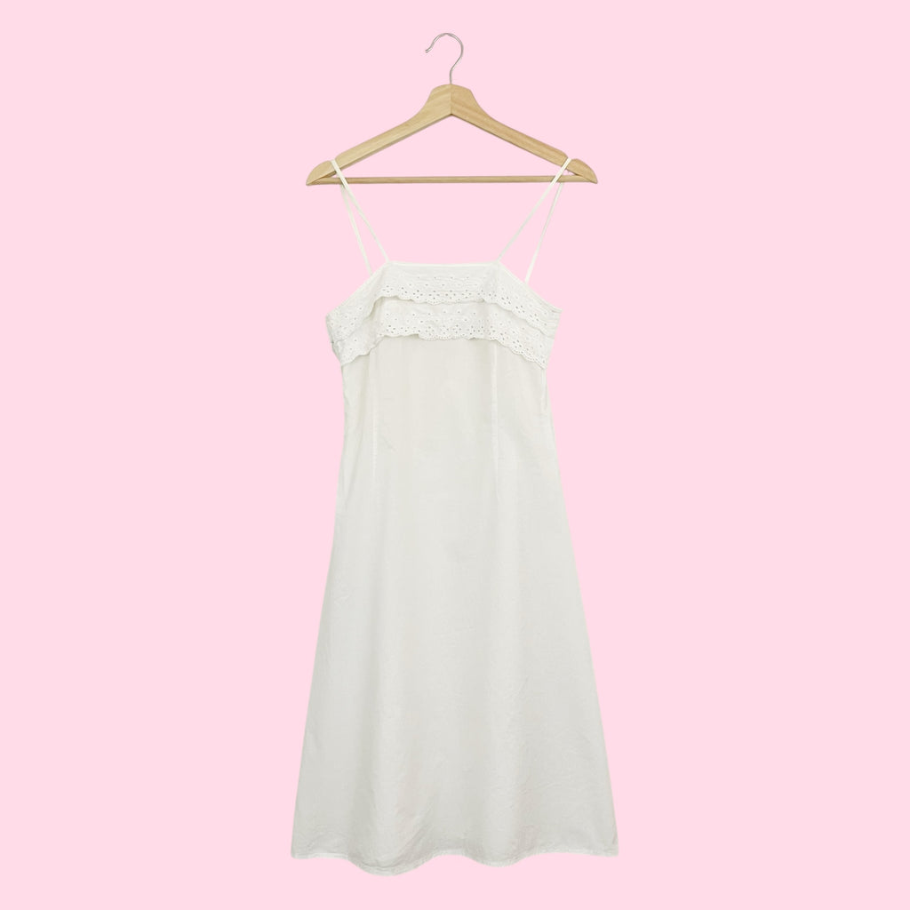 White Cotton Midi Dress w/ Eyelet Ruffle (XS)