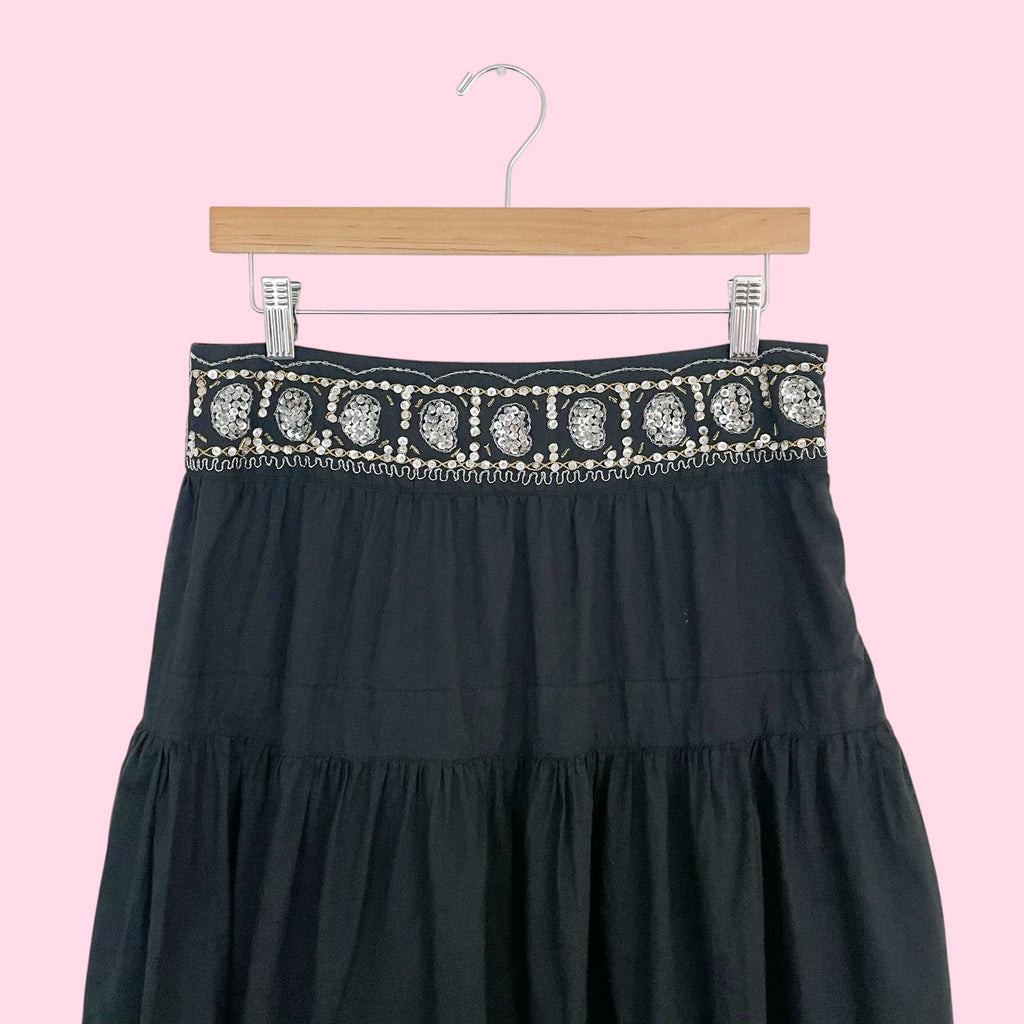 Y2K Black Cotton Tiered Skirt w/ Beaded Trim (8)